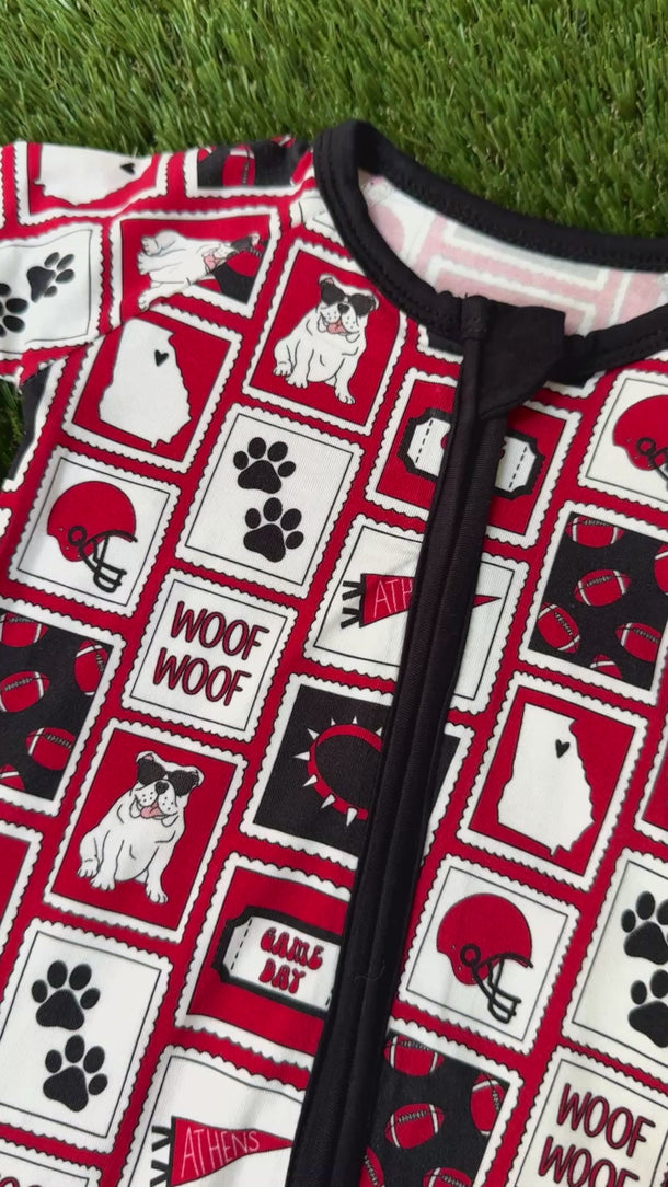 Our Athens Stamps bamboo zip pajamas celebrate Georgia spirit in the softest way possible. The breathable bamboo fabric keeps your baby comfy all night, while the playful stamp design adds a hometown touch.