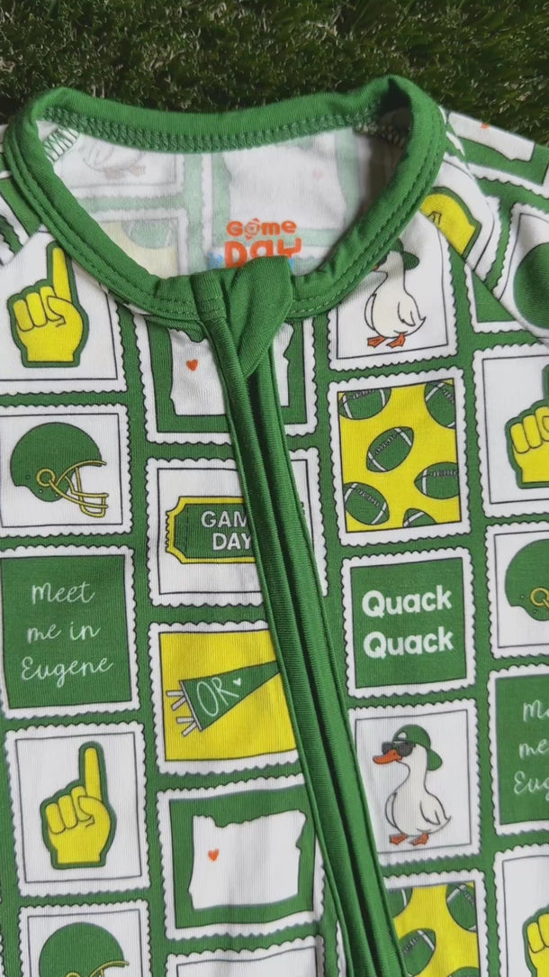 Game day dreams start here! Our Eugene Stamps bamboo zip pajamas combine buttery-soft comfort with bold green and yellow colors inspired by Oregon’s football spirit. Featuring a playful stamp-style design, these zips are perfect for bedtime, nap time, or cheering through late-night games.