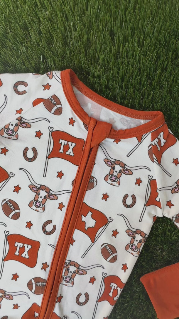 Bedtime just went burnt orange! π Our Texas Flags bamboo zip pajamas are buttery-soft, breathable, and full of Lone Star spirit. Featuring a playful football print in burnt orange and white, these zips are perfect for cozy nights, Saturday naps, and late-game cuddles.